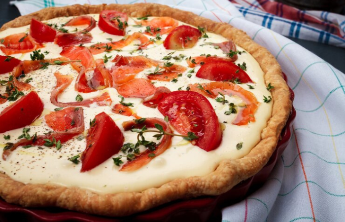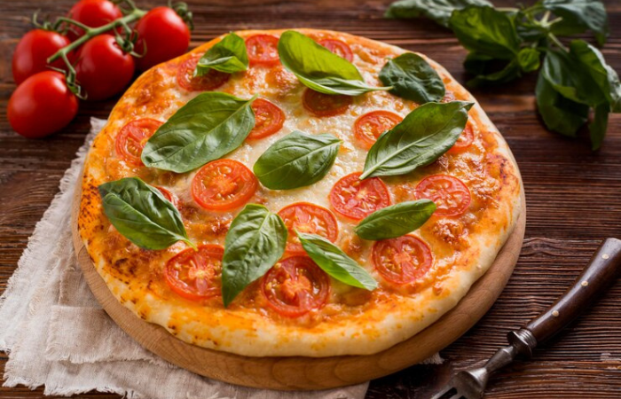 Queijo, tomate, oregano e manjericão.