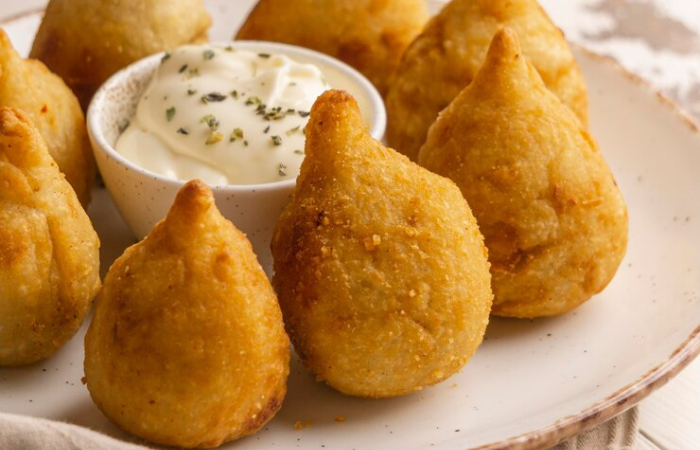 50 mini coxinhas de frango, com massa de batata, crocantes e cremosas